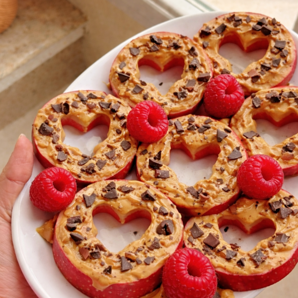 • Heart-shaped apple slices with raspberries