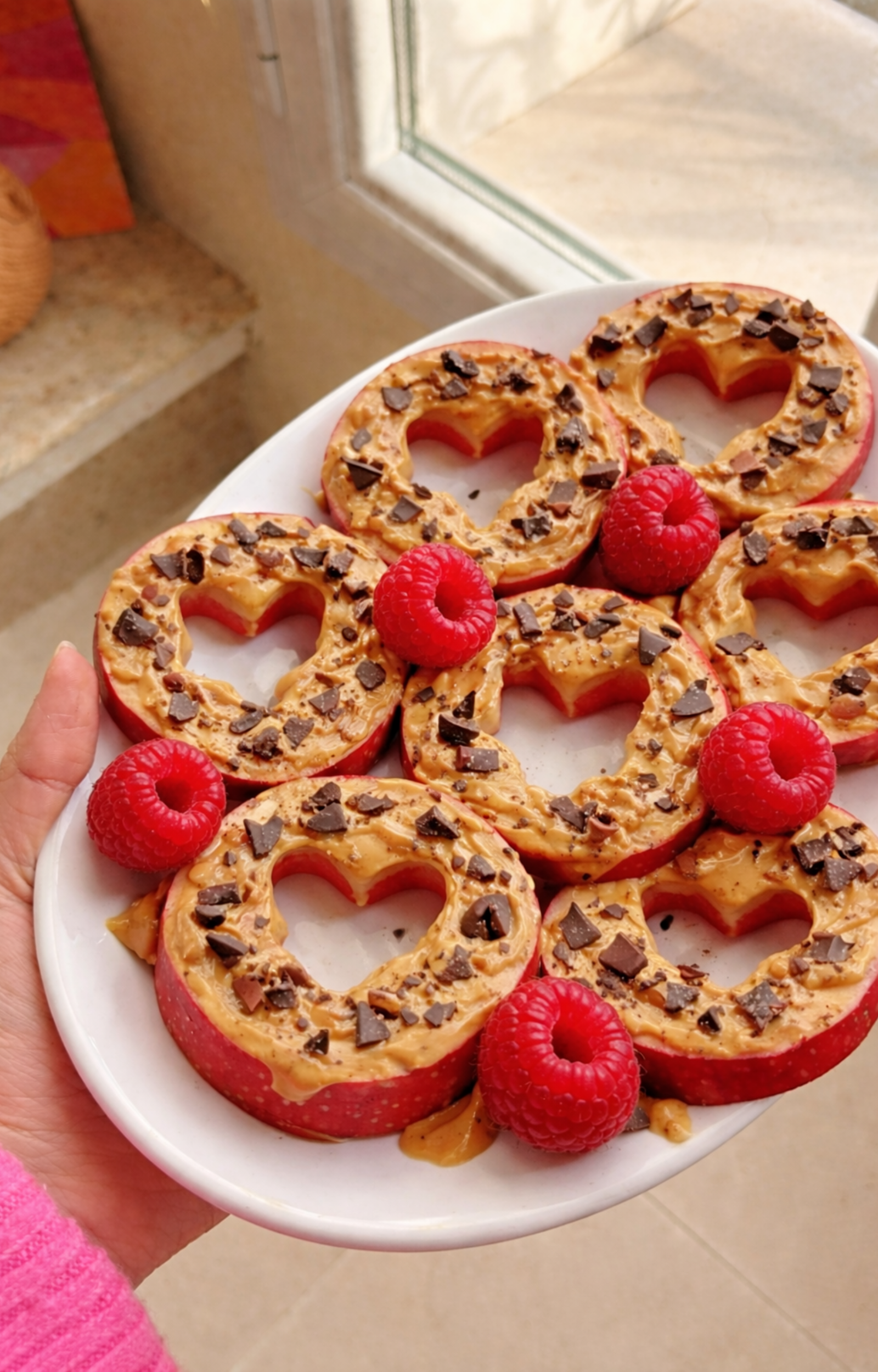 - Next, spread a thin layer of peanut butter on the apple slices.