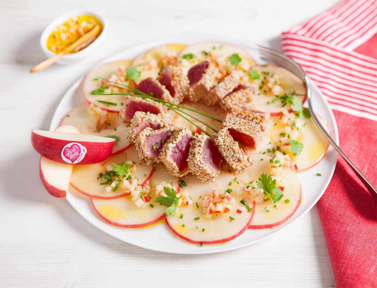 - Heat the butter in a frying pan and lightly fry the Pink Lady® slices.