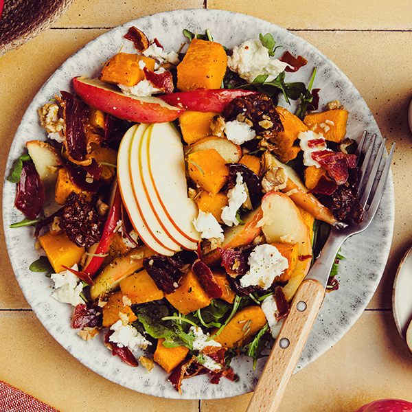 Ready in just 25 minutes, this quick and easy recipe is ideal for lightening up your evenings while delighting your taste buds! The combination of roasted squash, honey, Pink Lady® apples, rocket, goat’s cheese, sun-dried tomatoes and Serrano ham is simply perfect.